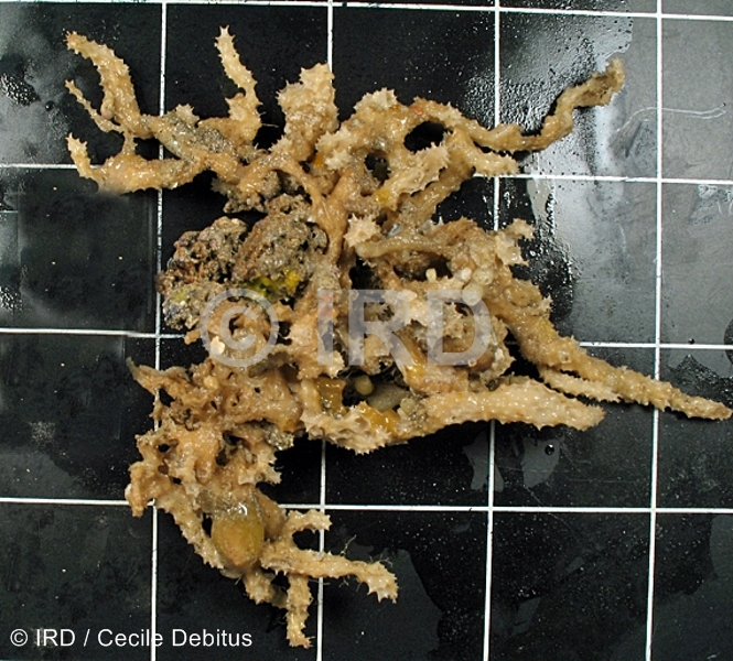 elongate cylindrical digitate growth form with multiple points of attachment to the substrate, and incorporating rubble, suggesting it is found on rubble substrates rather than reef